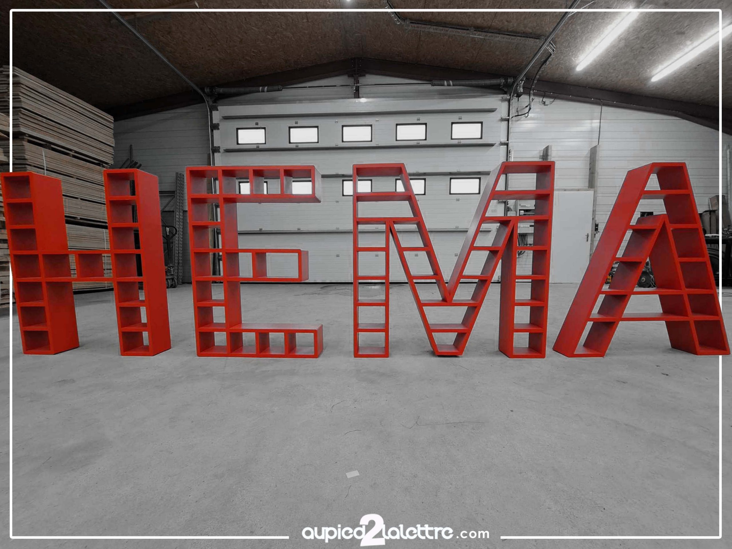 Les lettres et formes en bois peuvent être réalisées en grand format XXL, avec des hauteurs de plusieurs mètres, en fonction des contraintes techniques, du poids et du mode d’installation.